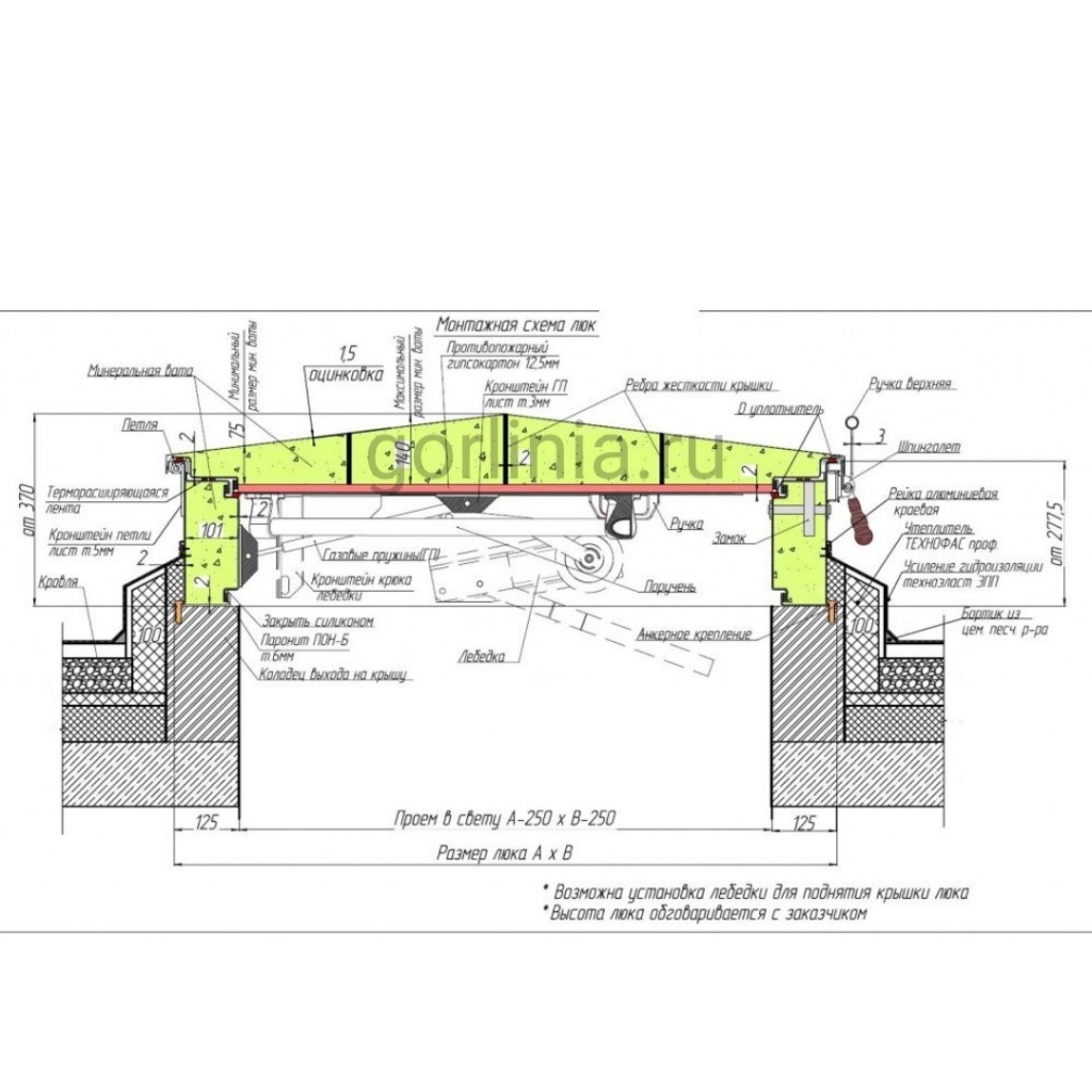 Рекомендуем заказать дополнительную лебедку для облегчения подъема створки с технического этажа после выпадения снега в зимнее время.