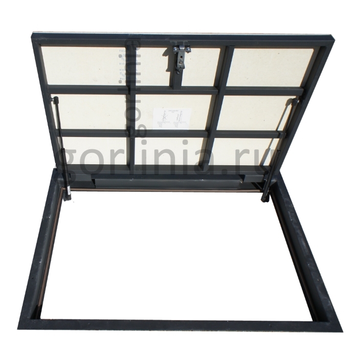 Люк напольный с замкнутым периметром. Конструкция смещенного за ось шарнирного соединения образует опорные поверхности в четверти по всем четырем сторонам, закрывает щель в полу под петлями, сохраняет размер проема в чистоте 1050х600.