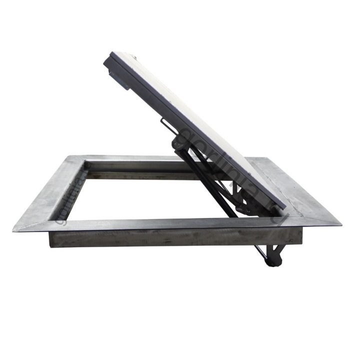 Вы ходите по закрытой крышке, как по обычному полу, обвязка полотна держит нагрузку до 200 кг на квадратный метр. Каркас опирается на трубу 15х15 по трем сторонам, на петли по четвертой.